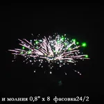 Эффекты: 1. Ярких ракет и рассыпаются на синие, зеленые и фиолетовые звезды. 2. Стробы, пальмы и трещащие хризантемы.